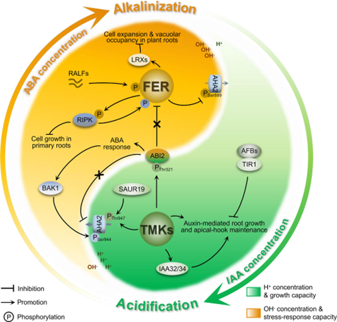富含亮氨酸重复序列类受体蛋白激酶TMK与FER通过磷酸化位于质膜的质子泵AHA2,从而控制H+的流动,以达到酸化与碱化的平衡。生长素对植物生长具有“低促高抑”现象,TMK作为生长素质膜上的受体,可维持植物体内合适的生长素浓度以促进生长。当高浓度生长素出现时,TMK通过磷酸化ABI2以开启ABA信号,低浓度的ABA可以促进植物的生长,而随着ABA浓度升高又会促进FER的磷酸化能力,抑制植物的酸性生长和生长素信号,以达到植物体内生长素和脱落酸平衡。“酸化和碱化平衡”、“生长素和脱落酸平衡”最终组成植物生长发育与逆境胁迫之间TMK-FER的动态平衡,且符合中国阴阳平衡的哲学理论。