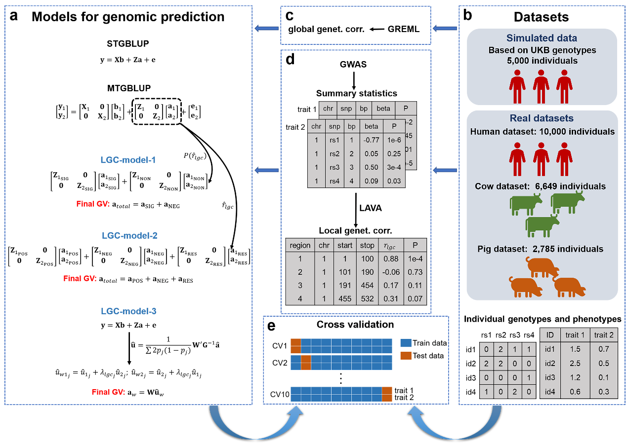 基因组预测在推动人类精准医疗以及加速动植物遗传改良方面具有巨大潜力。多性状基因组预测模型的预测准确性往往要优于单性状模型。然而,传统的多性状基因组预测模型(例如MTGBLUP)只考虑了性状间的整体遗传相关。随着局部遗传相关(LGC)估计方法的发展,现在可以分析特定基因组区域的性状间遗传相关,将局部遗传相关信息纳入多性状基因组预测模型有望提高预测准确性。我们提出了三种方法(LGC-model-1、LGC-model-2和LGC-model-3)来解决这一问题,并使用模拟数据和人类、牛和猪三个真实数据集评估了新方法的性能。研究结果表明,局部遗传相关在整个基因组中具有异质性。另外,与人类PRS模型(PRSice-2(C+T)、LDpred2和wMT-BLUP)和传统的多性状基因组预测模型(MTGBLUP)相比,三种方法可使预测准确性平均提高~12.76%。我们的研究结果凸显了考虑局部遗传相关信息对改进多性状基因组预测的重要性。