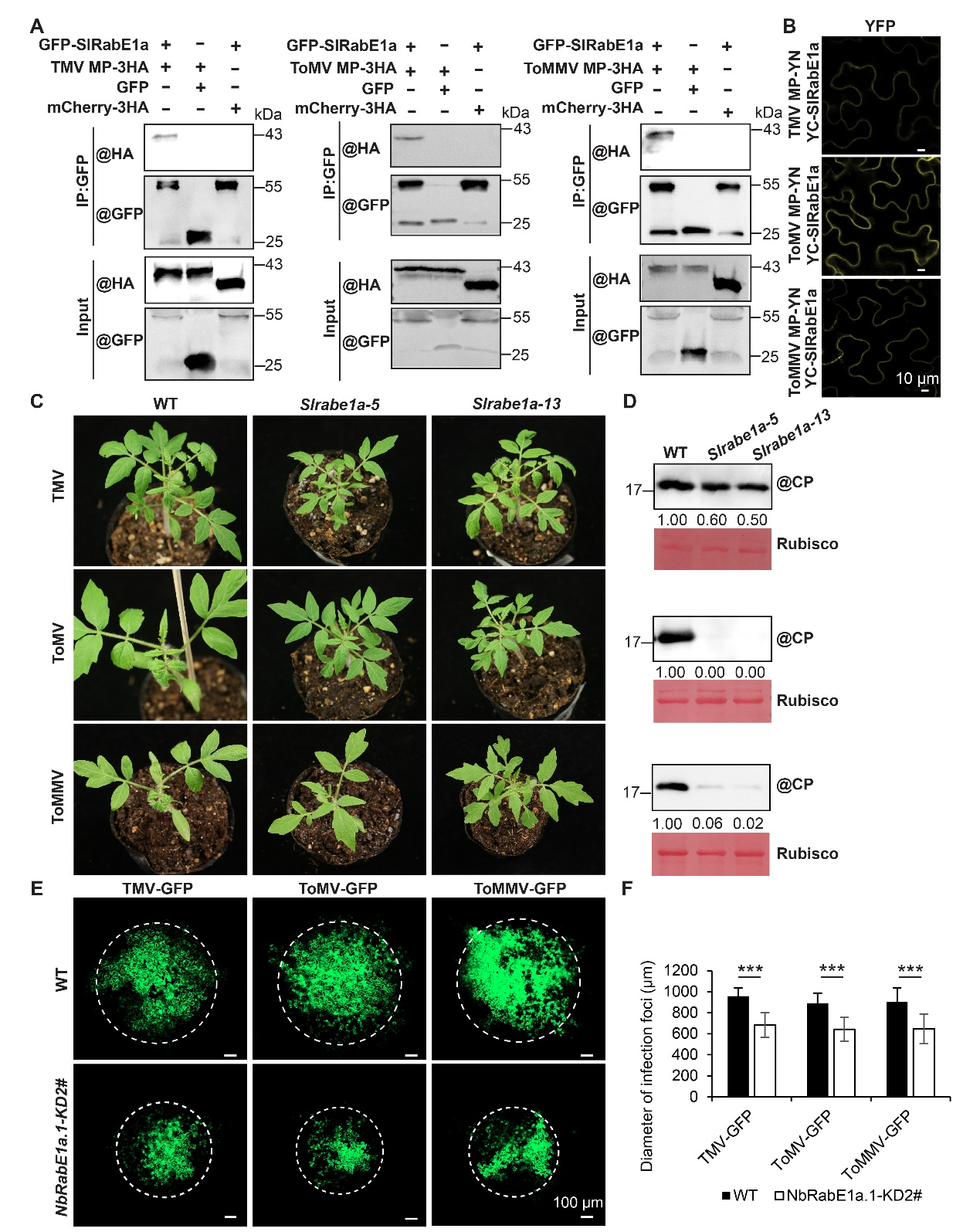 为研究SlRabE1a是否调控其他烟草花叶病毒属病毒的侵染,研究者验证了SlRabE1a与TMV、ToMV和ToMMV的MP之间的相互作用。Co-IP实验显示,SlRabE1a可以与TMV、ToMV和ToMMV的MP相互作用(图4A)。BiFC实验进一步证实了这些相互作用(图4B)。在番茄植株中敲除SlRabE1a抑制了TMV、ToMV和ToMMV的系统侵染(图4C和4D)。在本氏烟植株中沉默NbRabE1a.1也抑制了TMV、ToMV和ToMMV的细胞间运动(图4E和4F)。这些结果表明RabE1a在烟草花叶病毒属病毒的系统侵染和细胞间运动中至关重要。