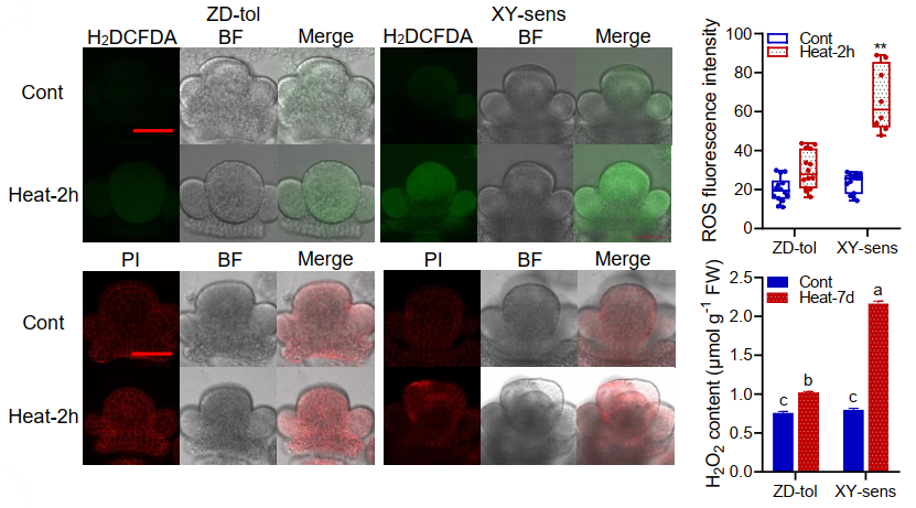 高温胁迫破坏了玉米雌穗的内质网功能。具体表现为线粒体结构受损、电子传递链异常,导致活性氧(ROS)水平升高,引发氧化胁迫、蛋白质未折叠或错误折叠以及细胞结构破坏。小花受精率和穗粒数分别较对照降低16%-42%和33%-54%,产量损失达29%-60%。ZD958通过更快地激活多种途径(如蛋白质分解代谢、能量代谢、碳水化合物代谢、氨基酸代谢和脂质代谢)、提高刺激检测阈值以及增强细胞ROS解毒能力,表现出较好的高温耐受性。相比之下,XY335的细胞解毒能力较弱,对温度表现出更高的敏感性。然而,施用ROS抑制剂能显著降低小花中ROS水平,减轻内质网应激,降低17%-31%的产量损失。该研究为玉米抗逆稳产栽培措施的研发提供了理论依据。